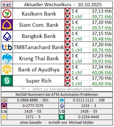 Diese Wechselkurse, deren Stand um ca. 10:00 Uhr Thaizeit war, die Kurse können sich jederzeit ändern, es sind nur Richtwerte.