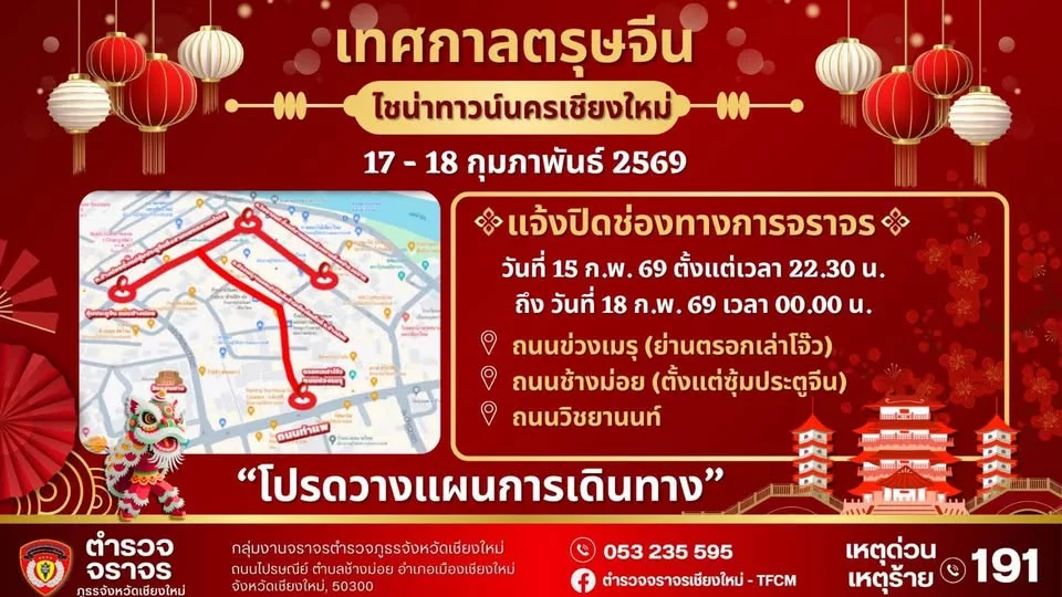 Die Parade zum chinesischen Neujahrsfest findet morgen, am 17. Februar, statt und beginnt um 8 Uhr morgens am Tha Pae Gate. Um 8.30 Uhr startet die Parade am Tha Pae Square und folgt dieser Route: