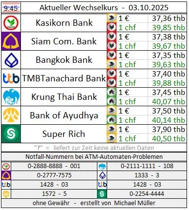 Diese Wechselkurse, deren Stand um ca. 10:00 Uhr Thaizeit war, die Kurse können sich jederzeit ändern, es sind nur Richtwerte.